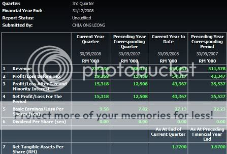 马星集团(MAHSING,8583)在截止2008年12月31日的全年业绩报告。全年净利达到9294万8000令吉,比2007年同期8225万8000令吉的净利升高13%。。